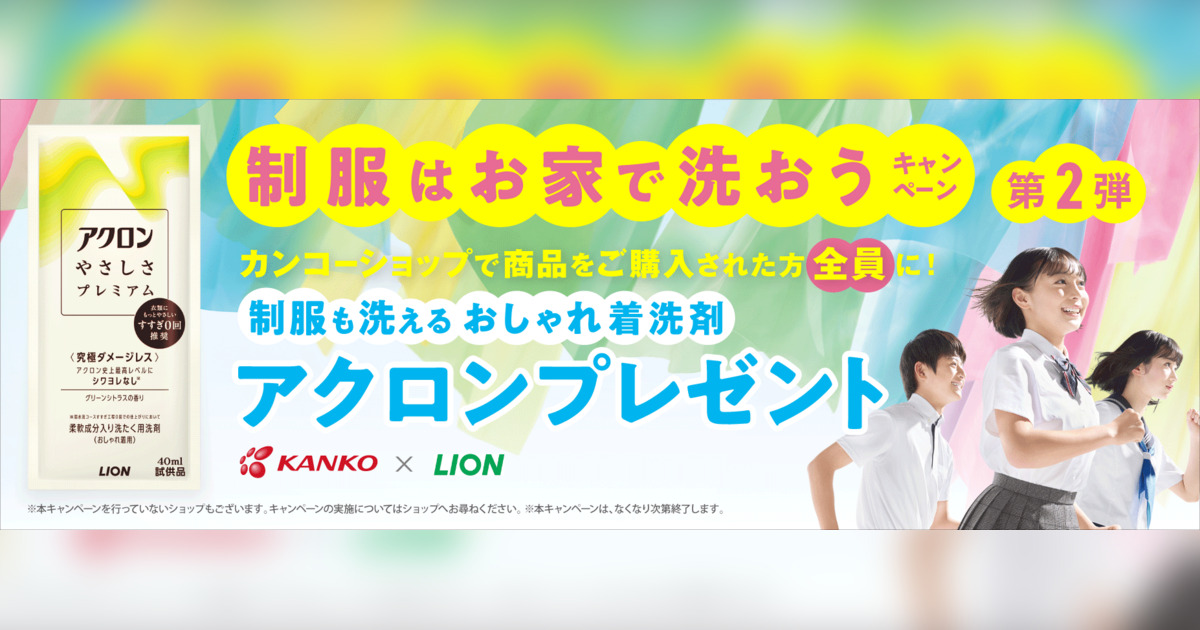 菅公学生服株式会社 (本社:岡山市北区駅元町、代表取締役社長:尾崎 茂 以下:カンコー学生服)は、 ライオン株式会社(本社:東京都台東区蔵前、代表取締役兼社長執行役員:竹森 征之 以下:ライオン)と連携して、制服の家庭洗濯の不安解消を目的とした「制服はお家で洗おうキャンペーン」の第2弾を2025年6月より実施いたします。このキャンペーンでは、カンコーショップで商品を購入される方に、ライオンの「アクロンやさしさプレミアム」や「洗濯魔法BOOK」を約2万名に無料でプレゼントいたします。