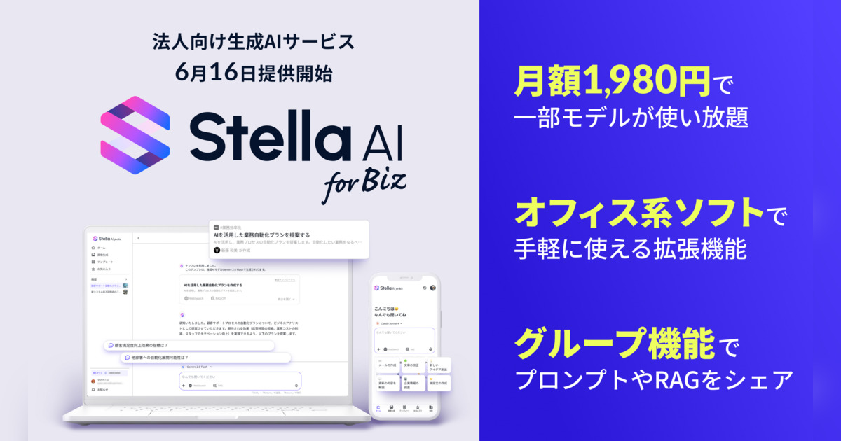 株式会社SUPERNOVA(以下 SUPERNOVA)は、従業員が手軽に生成AIを活用でき、組織・チーム横断での日常業務の生産性向上および新しい価値の創出を支援する法人向け生成AIサービス「Stella AI for Biz」 (以下 本サービス) を月額1,980円(税抜)/アカウントで、2025年6月16日(月)より提供開始します。