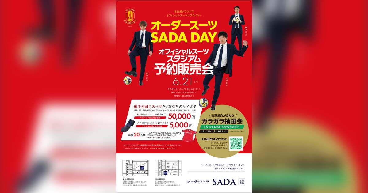 株式会社オーダースーツSADA(本社:東京都千代田区、代表取締役社長:佐田展隆)は、2025年6月21日(土)に開催される明治安田J1リーグ第21節 名古屋グランパス vs 清水エスパルスの会場にて実施する『オーダースーツ SADA DAY』にてオフィシャルスーツの予約会を開場~キックオフ(19:00)まで豊田スタジアム特設会場で開催いたします。オーダースーツSADAは、オフィシャルスーツサプライヤーとして名古屋グランパスを応援しています!