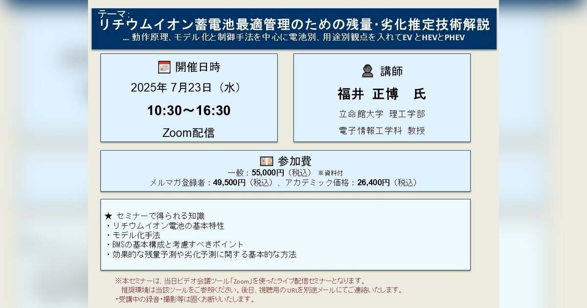 先端技術情報や市場情報を提供している(株)シーエムシー・リサーチ(千代田区神田錦町: https://cmcre.com/ )では、 各種材料・化学品などの市場動向・技術動向のセミナーや書籍発行を行っておりますが、 このたび「リチウムイオン蓄電池最適管理のための残量・劣化推定技術解説… 動作原理、モデル化と制御手法を中心に電池別、用途別観点を入れてEV とHEVとPHEV」と題するセミナーを、 講師に福井 正博 氏(立命館大学 理工学部 電子情報工学科 教授)をお迎えし、2025年7月23日(水)10:30より、 ZOOMを利用したライブ配信で開催いたします。 受講料は、 一般:55,000円(税込)、 弊社メルマガ会員:49,500円(税込)、 アカデミック価格は26,400円(税込)となっております(資料付)。