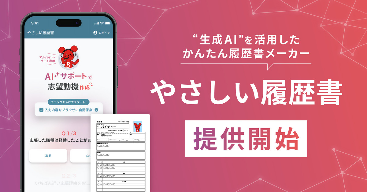 ディップ株式会社(以下「当社」)が運営する日本最大級のアルバイト・パート求人サイト「バイトル」は、ユーザーの履歴書作成の負担を軽減する新機能「やさしい履歴書」(以下「本機能」)を開始しました。