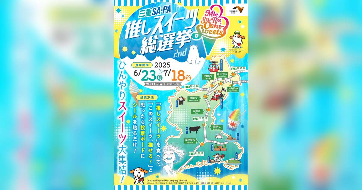 中日本エクシス株式会社 三重支店(三重県四日市市鵜の森、支店長・山本(やまもと)武司(たけし))は、三重県内のサービスエリア(SA)パーキングエリア(PA)の店舗(一部除く)において、一昨年大好評であった、自慢のスイーツを競い合いNo.1を決定する“三重SA・PA推しスイーツ総選挙 ひんやりスイーツ大集結!”を開催します。