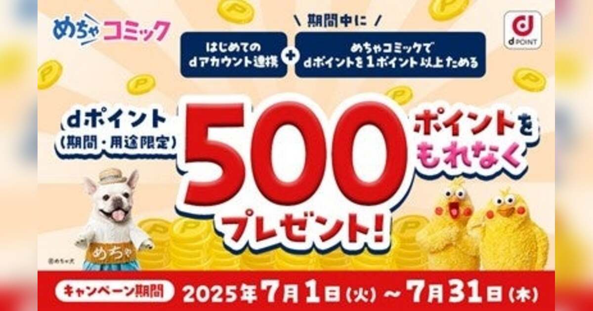 「めちゃコミック」でdポイントがご利用可能になることを記念して、dポイント(期間・用途限定)最大500ポイントを進呈する「dポイントスタート記念キャンペーン」を2025年7月1日(火)から2025年7月31日(木)までの期間で開催いたします※4。
