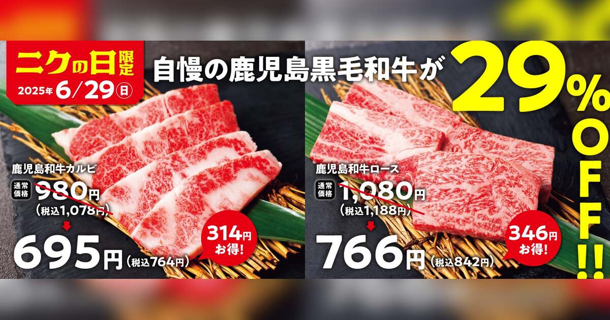 ワタミ株式会社(本社:東京都大田区、以下ワタミ)が全国で展開する、高品質な焼肉をリーズナブルな価格で提供する「焼肉の和民」で毎月恒例となりました「ニクの日」企画。2025年6月29日(日)は「焼肉の和民」自慢の鹿児島黒毛和牛を使用した「鹿児島和牛カルビ」と「鹿児島和牛ロース」を通常価格から29%OFFで提供します。「鹿児島和牛カルビ」は1皿980円(税込1,078円)から695円(税込764円)と314円お得。「鹿児島和牛ロース」1皿1,080円(税込1,188円)から766円(税込842円)と346円お得です。おひとり様の注文制限はなく、何皿でもご注文いただけます。黒毛和牛をお得に楽しめるこの機会にぜひ焼肉の和民へお立ち寄りください。