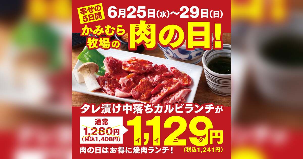 6月の肉の日企画は、2025年6月25日(水)から29日(日)までを「幸せの5日間」とし、期間限定で平日の11時から16時に販売している焼肉ランチのオススメメニュー「タレ漬け中落ちカルビ」セットを通常価格1,280円(税込1,408円)のところ、「いい肉」になぞらえた1,129円(税込1,241円)で販売します。