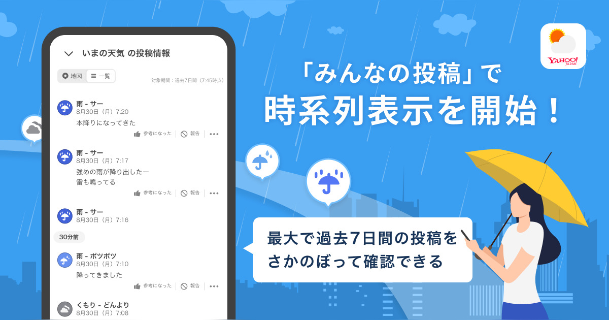 【Yahoo!天気アプリ】「みんなの投稿」で時系列表示を開始 いまの天気などのユーザー投稿が最大で7日間さかのぼって確認できる