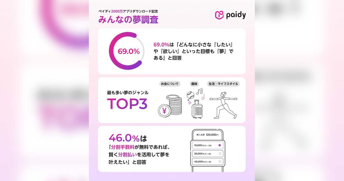 業界をリードするあと払い(BNPL)サービス「ペイディ」を提供する株式会社Paidyは、「ペイディアプリ」のダウンロード数が2000万を突破したことをお知らせします。これを記念し、Paidyの「夢に自信を、心に余裕を持てる世界を作る」のパーパスに合わせて、全国の18歳から69歳の男女3,000名を対象に夢に関する意識調査「みんなの夢調査」を実施しました。