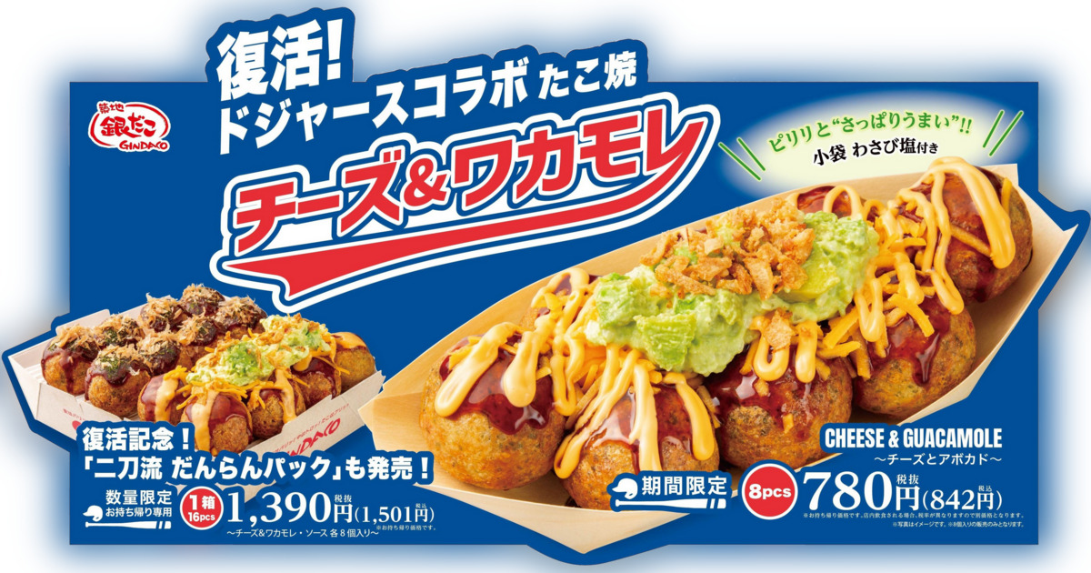 築地銀だこ を展開する株式会社ホットランドホールディングス (本社:東京都中央区、代表取締役社長:佐瀬守男)は、昨年、米国のプロ野球球団:ロサンゼルス・ドジャース(Loa Angeles Dodgers)と共同で開発・発売した、2024シーズンコラボ商品 『チーズ&ワカモレ (CHEESE & GUACAMOLE) 』 を、2025年6月24日(火)都内限定店舗にて先行発売、その後7月1日(火)より、日本国内の築地銀だこ店舗(催事・競馬場・球場等の一部店舗を除く)にて、期間・数量限定で復活販売いたします!さらに!当商品の復活販売を記念し、お持ち帰り専用商品 『二刀流 だんらんパック(16個入り)』 も期間・数量限定(酒場・催事・競馬場・球場等一部店舗を除く)で発売いたします!