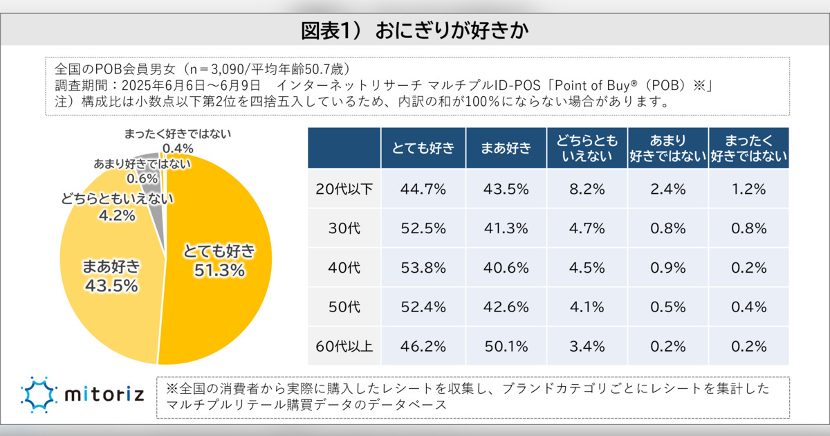 株式会社mitoriz(本社:東京都港区、代表取締役社長:木名瀬博)は、消費者購買行動データサービス「Point of Buy®(以下、POB)」の会員3,090人に「おにぎりに関する調査」を実施いたしました。