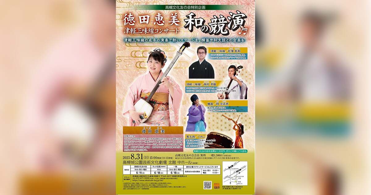 令和7年8月31日(日曜日)、高槻城公園芸術文化劇場で、世界大会での入賞経験がある高槻市在住の津軽三味線奏者・徳田恵美さんによるコンサートが開催。津軽三味線の名手の熱いステージをお届けします。