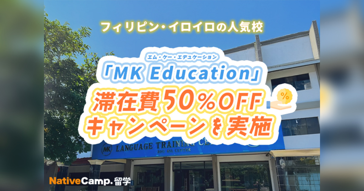 ネイティブスピーカーと回数無制限のオンライン英会話サービス「ネイティブキャンプ英会話」を展開する株式会社ネイティブキャンプ(東京都渋谷区 代表取締役: 谷川国洋)は、海外留学エージェントサービス「ネイティブキャンプ留学」において、フィリピン・イロイロの人気校「MK Education」にて、滞在費 50%OFF キャンペーンを実施いたします。