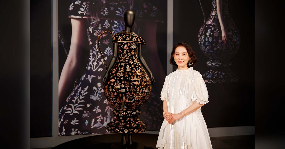 正倉院宝物の一つで、鳥の頭を象った蓋をもつペルシア風の水差し「漆胡瓶(しっこへい)」をモチーフに制作したドレスについて、「漆胡瓶の独特な存在感に魅了され、そのシルエット、オリエンタルな魅力を形にしたいと感じたことが着想になりました。動物や昆虫、植物の文様を手作業でトレース、加工し、400以上のパーツをドレス本体に装飾しました。構想から約1年かけ、纏うアートピースの象徴として、宝物をファッションへと昇華させたのがこのドレスです。文様の細かな表情もぜひ近くでじっくりと見ていただきたいです。」と語りました。