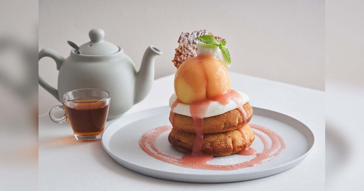 ジューシーな“岡山白桃”に、とろける甘さの焦がしブリュレを重ねた、贅沢なパンケーキ。カリッと香ばしいチュイルが軽やかな食感のアクセントに。仕上げにアールグレイミルクティーソースをとろりとかけて、香りと甘さの移ろいをお楽しみください。