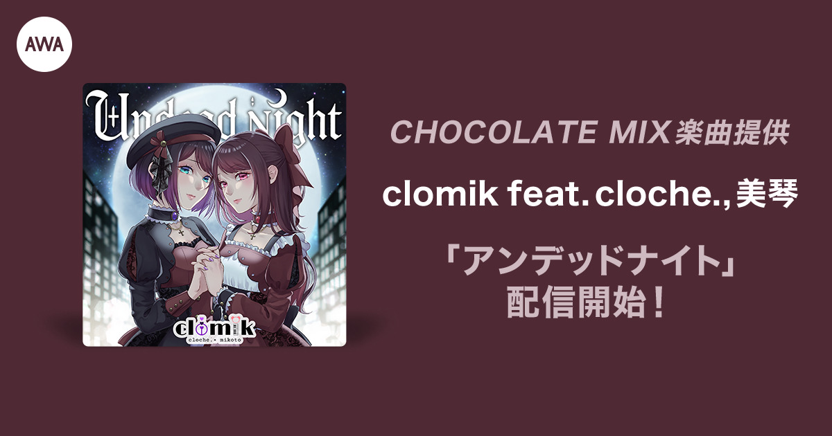 AWA株式会社(本社:東京都港区、代表取締役CEO:冨樫晃己)が運営する、サブスクリプション型(定額制)音楽ストリーミングサービス「AWA(アワ)」は、IZ*ONE、乃木坂46、櫻坂46など有名アイドルグループへ多数楽曲提供している CHOCOLATE MIXの楽曲提供オーディションを開催。この度、入賞者のclomik feat. cloche. , 美琴が歌う「アンデッドナイト」がリリースされました。是非、注目の音楽プロデューサーCHOCOLATE MIXと新進気鋭の歌い手のコラボレーションをお聴きください。