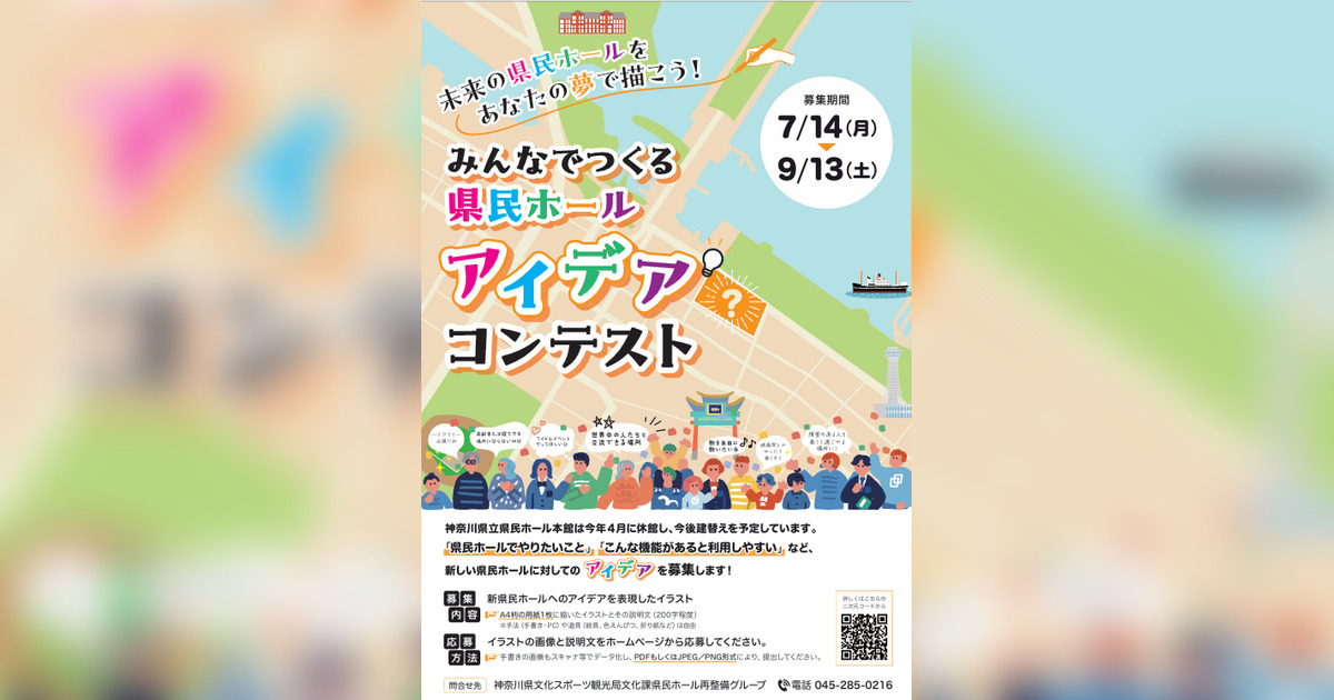 神奈川県立県民ホール本館の建替えにあたり、今年度中に新しい県民ホールが目指すべき方向性や求められる機能等を整理した基本構想を策定する予定です。この基本構想に県民の皆様からの意見を反映させ、新県民ホールに親しみをもっていただくことを目的として、「みんなでつくる県民ホールアイデアコンテスト」を次のとおり実施します。