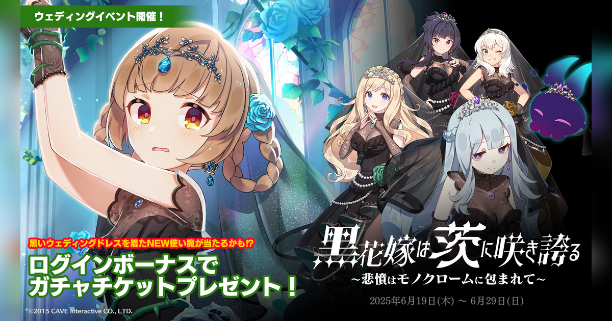 株式会社ケイブ(本社:東京都目黒区、代表取締役社長:秋田英好、証券コード:3760)が配信中のシューティングゲームアプリ『ゴシックは魔法乙女〜さっさと契約しなさい!~』(『ごまおつ』)におきまして、6月19日(木)よりウェディングイベント『黒花嫁は茨に咲き誇る〜悲憤はモノクロームに包まれて〜』を開始いたしました。