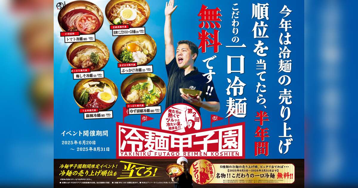株式会社FTG Company(本社:東京都目黒区、代表取締役社長:李 純哲)が運営する「大阪焼肉・ホルモン ふたご」は、2025年6月20日(金)~8月31日(日)の期間限定で『冷麵甲子園2025』をスタートします。焼肉ふたごの人気メニュー「名物‼ふたごの一口冷麺」に、5種類のオリジナル冷麵が仲間入り!全麺制覇したくなる自慢の一口冷麺を是非お楽しみください。