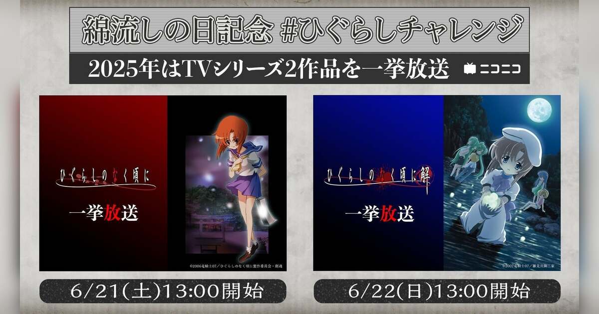 株式会社ドワンゴは、ライブ配信サービス「ニコニコ生放送」にて、6月21日(土)と6月22日(日)の2日間にわたり、『ひぐらしのなく頃に』アニメシリーズ2作品を全話無料一挙放送する特集企画「綿流し2025ひぐらしチャレンジ」を実施します。