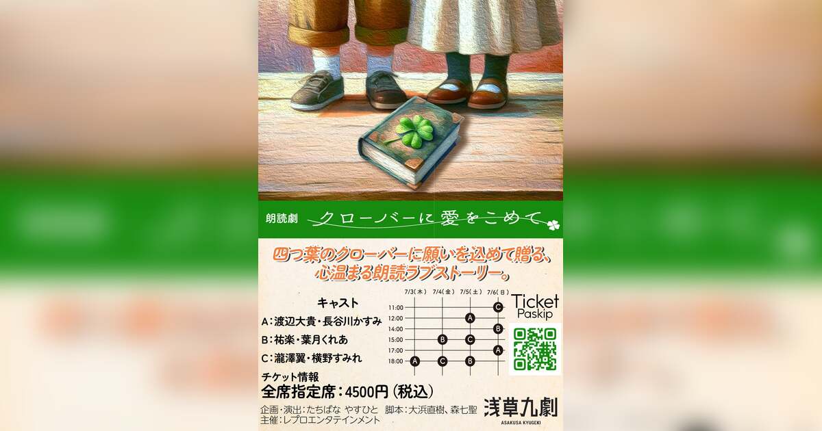株式会社レプロエンタテインメントが運営する浅草九劇で、朗読劇『クローバーに愛をこめて』を上演いたします。公演日程は、7/3(木)~6(日)となります。