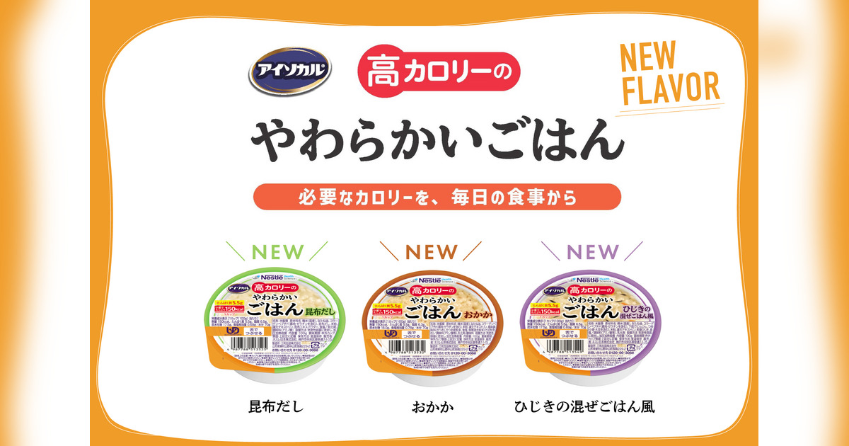 ネスレ日本株式会社 ネスレ ヘルスサイエンス カンパニー(本社:兵庫県神戸市、カンパニープレジデント:中島 昭広、以下「ネスレ ヘルスサイエンス」)は、2025年6月24日(火)より、介護食「アイソカル® 高カロリーのやわらかいごはん」シリーズに、新たに和風の味わい3種(昆布だし・おかか・ひじきの混ぜごはん風)を加え、全国で販売を開始します。