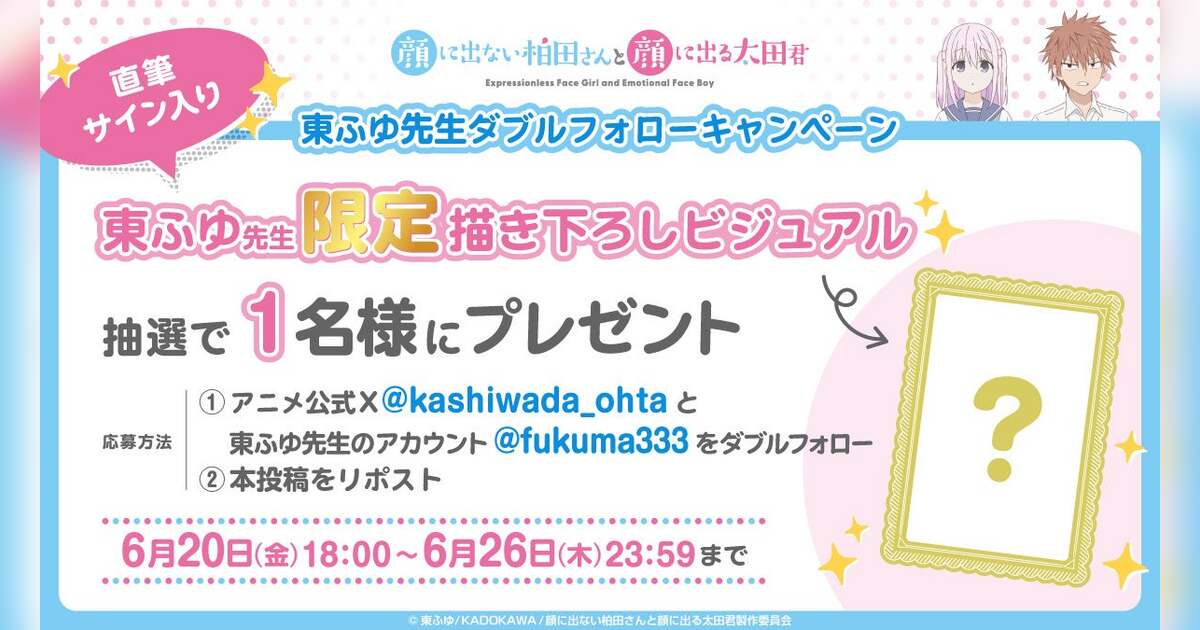 TV アニメ『顔に出ない柏田さんと顔に出る太田君』が 2025 年 10 月に放送開始することが決定しました!さらに、10 月放送開始を記念して、東ふゆ先生限定描き下ろしビジュアル(直筆サイン入り)が当たるダブルフォローキャンペーンも開始しました!キャンペーン詳細は公式 X をご確認の上、ぜひご参加ください!