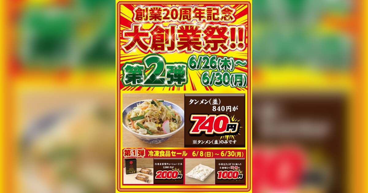 株式会社松富士食品(本社:東京都千代田区)は、2025年4月18日をもちまして、創業20周年を迎えました。これを記念し、タンメン トナリ全店(町中華トナリ飯店を含む)にて、タンメン〈並盛〉を100円引きの特別価格で販売いたします。