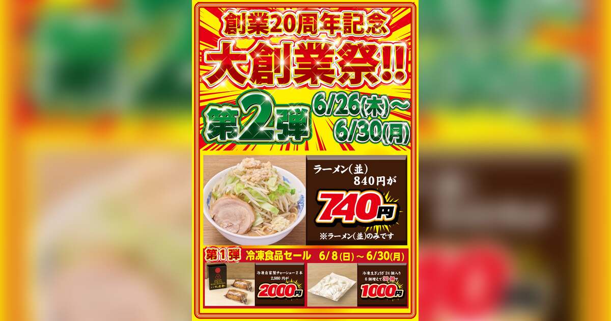 株式会社松富士食品(本社:東京都千代田区)は、2025年4月18日をもちまして、創業20周年を迎えました。これを記念し、「ジャンクガレッジ」全店にて、ラーメン〈並盛〉を100円引きの特別価格で販売いたします。