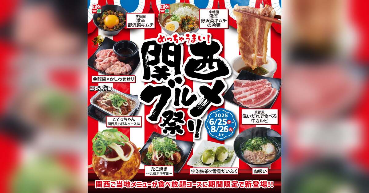 ワタミ株式会社(東京都大田区、以下ワタミ)と国内有数の和牛生産者であるカミチクグループ(鹿児島県鹿児島市)との合弁会社、ワタミカミチク株式会社(東京都大田区、以下ワタミカミチク)が展開する「かみむら牧場」は、2025年6月25日(水)から2025年8月26日(火)まで期間限定で、めちゃうまい!「関西グルメ祭り」を開催します。今回は、“関西を代表するご当地メニュー”をテーマに、地元で親しまれている味を再現した全8品をご用意。さらに、「こてっちゃん」や「キンリューフーズ」、「李朝園」など、関西でおなじみの有名企業や商品とのコラボ商品もラインナップ。関西の“ソウルフード”を、焼肉食べ放題と一緒にたっぷりとお楽しみいただけます。