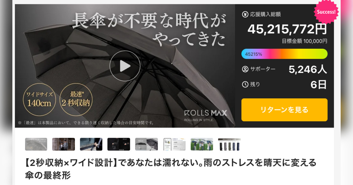 LEGEND MARKETING株式会社(東京都港区、代表取締役社長:林 南序)が2025年5月25日に公開した台湾の傘ブランド「ROLLS」より登場した最新モデル『ROLLS MAX』が、わずか2週間でクラウドファンディングの応援購入額の日本記録を更新した。プロジェクト公開1ヶ月後の現在の応援購入額は、4,400万円を突破し、最終日には5,000万円以上の応援購入が見込まれています。