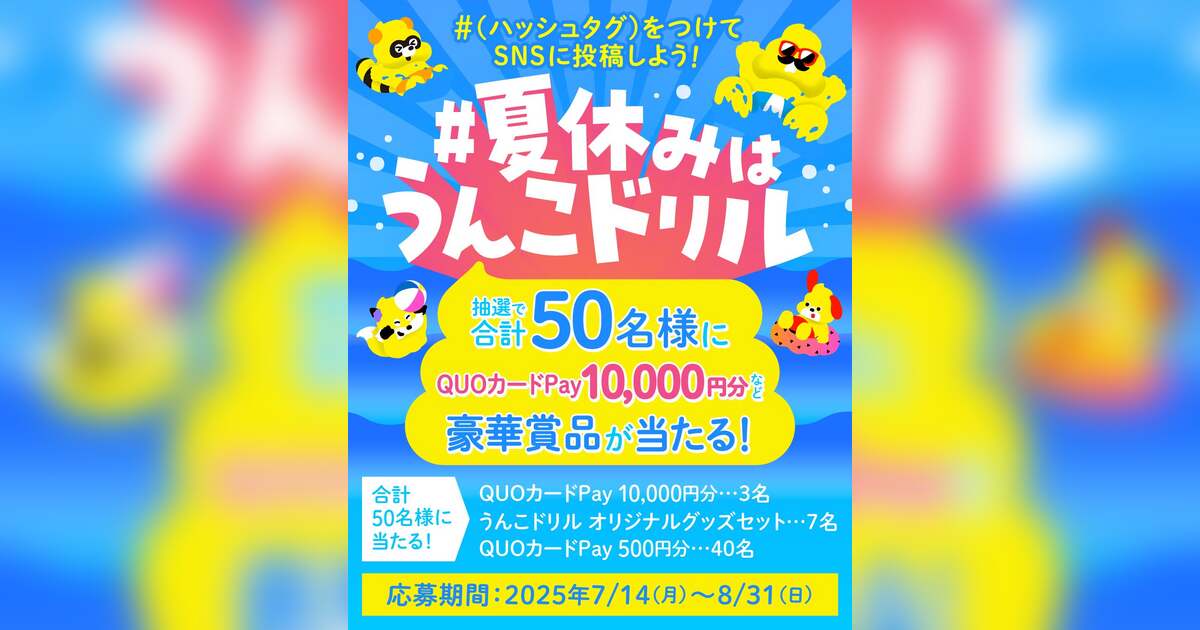 株式会社文響社(本社:東京都港区、代表取締役:山本周嗣)は、小学生を中心に絶大な人気を誇る「うんこドリル」シリーズにおいて、2025年7月14日(月)より「豪華賞品が当たる!#夏休みはうんこドリル」キャンペーンを開催することをお知らせいたします。