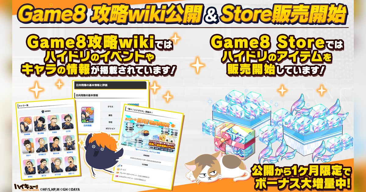 株式会社ゲームエイト(本社:東京都渋谷区、代表取締役社長:沢村俊介、以下、ゲームエイト)は、ゲーム総合情報サイト「Game8」内のECサービス「Game8 Store」において、2025年6月23日よりスマートフォンゲーム『ハイキュー!! TOUCH THE DREAM』(以下、ハイドリ)のゲーム内アイテム販売を開始したことをお知らせいたします。