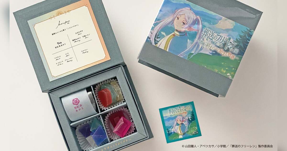 6月22日(日)より福岡三越9階「三越ギャラリー」にてスタートする「アニメ 葬送のフリーレン展」にて、こうぶつヲカシとのコラボお菓子の販売が決定しました。ハラペコラボのこうぶつヲカシは、ひとつひとつ職人が小刀で切り出すアート作品のような寒天菓子【琥珀糖】で、リアルな鉱物や宝石を模しているのが特徴。福岡会場の限定商品『葬送のフリーレンオリジナルこうぶつヲカシ』には、ルビー色の宝石、蛍石、九州素材の琥珀糖、こだわりの和紅茶のティーバッグが入り、存分にお楽しみいただける一箱になっています。イベントキービジュアルのイラスト入りパッケージに、キャラクターのステッカーが1枚つき。