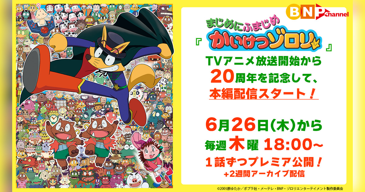 株式会社バンダイナムコピクチャーズ(本社:東京都杉並区、代表取締役社長:佐藤弘幸)は、2005年からのTVアニメ『まじめにふまじめ かいけつゾロリ』放送開始20周年を記念し、公式YouTubeチャンネル「BN Picturesチャンネル」にて、期間限定無料配信いたします。6月26日(木)より全97話を毎週木曜日18時から1話ずつプレミア公開、さらに2週間アーカイブ配信いたします。