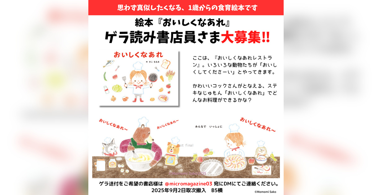 マイクロマガジン社(東京都中央区)は、2025年9月刊行予定の新作絵本『おいしくなあれ』のゲラ(校了前の原稿)を読んでくださる書店員さまを募集いたします。