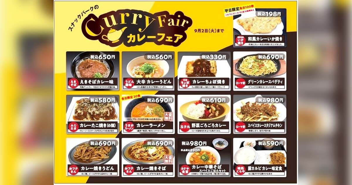 阪神梅田本店が誇る”早い、安い、旨い”の三拍子が揃う「スナックパーク」11店舗から、13種類のカレーメニューが期間限定で登場します。