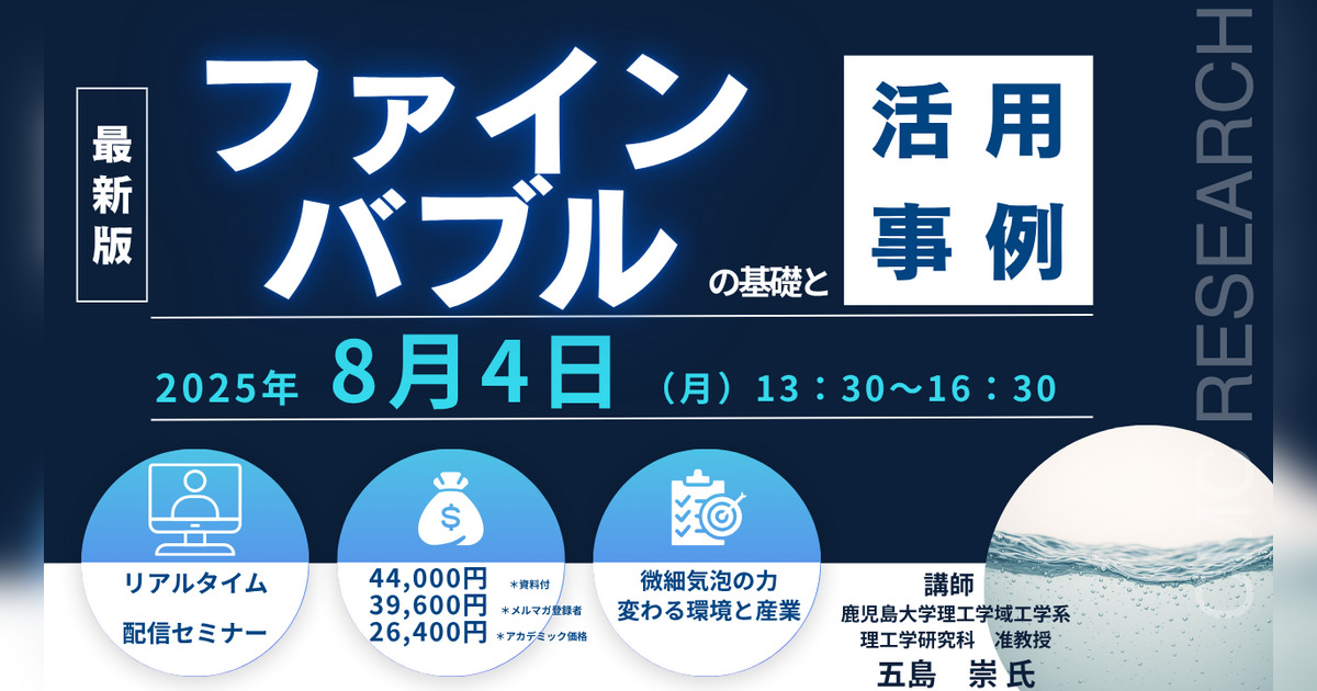 先端技術情報や市場情報を提供している(株)シーエムシー・リサーチ(千代田区神田錦町: https://cmcre.com/ )では、 各種材料・化学品などの市場動向・技術動向のセミナーや書籍発行を行っておりますが、 このたび「ファインバブルの基礎と活用事例」と題するセミナーを、 講師に五島 崇 氏  (鹿児島大学理工学域工学系 理工学研究科 (工学系) 工学専攻 化学工学プログラム 准教授)をお迎えし、2025年8月4日(月)13:30より、 ZOOMを利用したライブ配信で開催いたします。 受講料は、 一般:44,000円(税込)、 弊社メルマガ会員:39,600円(税込)、 アカデミック価格は26,400円(税込)となっております(資料付)。