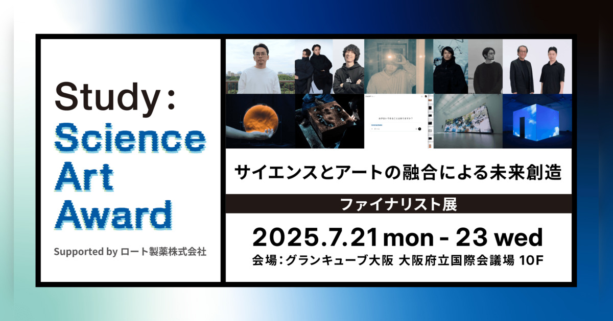 大阪関西国際芸術祭実行委員会が開催する「Study:サイエンス・アートアワード Supported by ロート製薬株式会社」は、サイエンスとアートの融合によって生まれる新たな創造性を探求することを目的としたアワードです。2025年7月20日17時よりグランプリとロート賞の受賞者を発表し、最終審査員である黒澤浩美氏、建畠晢氏、⼭極壽⼀氏、鈴⽊⼤輔氏、協賛企業であるロート製薬株式会社代表取締役会長・山田邦雄氏によるアワード授賞式が行われます。