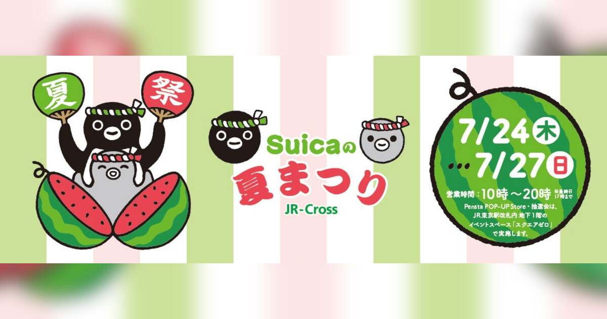 株式会社JR東日本クロスステーション(所在地:東京都渋谷区、代表取締役社長:西野史尚、以下「JR-Cross 」)は、2023年から開催しているSuicaの夏まつりイベントを今年も開催いたします。Suicaのペンギングッズの先行販売商品を多く取り揃えた「Pensta POP-UP Store」や、Suicaでお買いものをすると参加できる「Suicaで大抽選会」、Suicaのペンギンと一緒に写真撮影ができる「Suicaのペンギン撮影会」などを実施します。