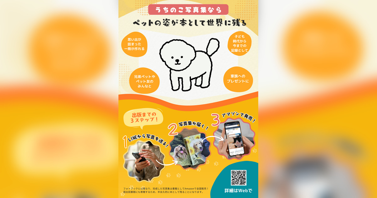 『うちのこ写真集』で完成した写真集は従来のフォトブックとは異なり、書籍としてAmazonで全国オンライン発売いたします。さらに国立国会図書館への寄贈を行うため、大切なペットとの思い出が半永久的に本として保存され、未来へ残せるという大きな特徴があります。