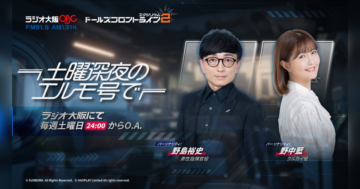声優の「野島裕史」さん「野中藍」さんをパーソナリティに迎えラジオ大阪にてラジオ番組『ドールズフロントライン2:エクシリウム 土曜深夜のエルモ号で』を、2025年7月5日(土)24:00より放送開始いたします。