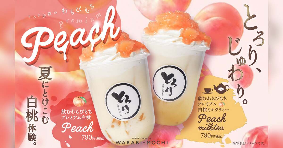 夏のご褒美、ひんやりとろける桃スイーツドリンク。白桃のやさしい甘さと香りをミルクでまろやかに仕立てた、なめらかドリンクの底にはとろとろのわらびもち入り。ホイップクリームと、白桃果肉をたっぷり使ったジューシーなソースをオン。とろける口どけと果実感で、桃好きにはたまらない夏限定のご褒美ドリンクです 。
