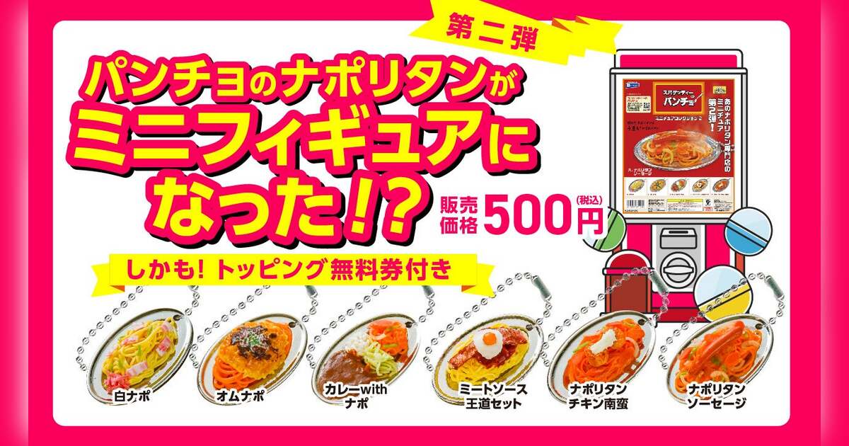 昨年夏に続く第二弾となる今回、店舗での定番メニュー「白ナポ」「オムナポ」「カレーwithナポ」に人気のトッピング2種(チキン南蛮・ソーセージ)、そしてナポリタンに並ぶ人気メニュー「ミートソース(王道セットトッピング)」の全6種類が新たにミニフィギュアで登場です。そして今回も全国のパンチョで使える「トッピング無料券」の特典付き!