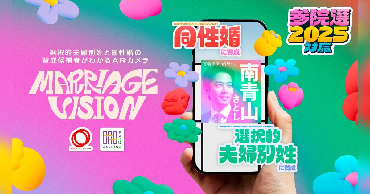 結婚の平等(同性婚の法制化)実現を目指す、公益社団法人Marriage For All Japan – 結婚の自由をすべての人に(以下、マリフォー)と、選択的夫婦別姓実現と、ジェンダー平等を推進する一般社団法人あすには(以下、あすには)は初の共同企画として、街頭に掲示される参院選の選挙ポスターにスマートフォンをかざすだけで、候補者が「選択的夫婦別姓」と「同性婚」、それぞれの法制化に賛成しているかを一目で見分けることができるARカメラ「MARRIAGE VISION(マリッジビジョン)」(https://marriage-vision.com/)を開発しました。7月10日(木)よりサービスの利用を開始します。日本全国の選挙区で利用可能になることを目指し準備を進めます。