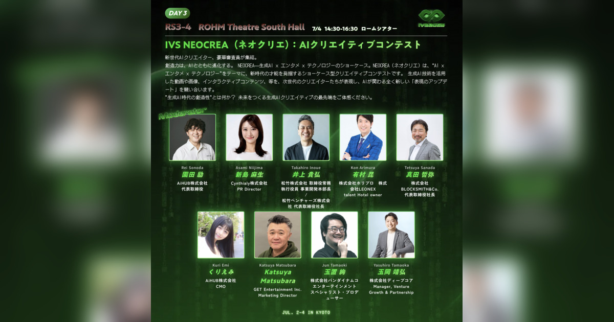Cynthialy株式会社(本社:東京都渋谷区、代表取締役:國本知里、以下 Cynthialy)は、京都で行われる日本最大級のスタートアップカンファレンス「IVS2025」(以下、IVS)の公認サイドイベントとして、生成AIを活用した次世代クリエイティブコンテスト「IVS NEOCREA」を開催します。