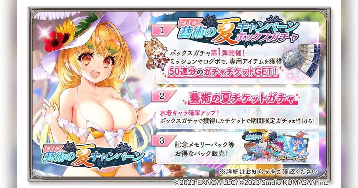 最大50連分のガチャチケットがもらえるボックスガチャや、過去登場した水着衣装の★5スタイルの出現確率がアップしたチケットガチャ、記念メモリーパック等お得なパック販売を実施しております。