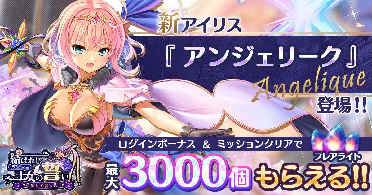また、ログインボーナス&ミッションクリアで最大3000個のフレアライトなどがもらえる『新規入学キャンペーン』や、アンジェリーク加入イベント『結ばれし王女の誓い 希望は笑顔と共に』を合わせて開催しておりますことをお知らせいたします。