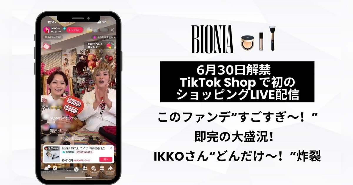 本配信は、同日より国内提供が開始された「TikTok Shop」を活用したコマース連動型のショッピングLIVE配信として実施され、TV通販でもカリスマであるIKKOさんがLIVEコマースをいち早く実施。LIVE配信記念の特別価格セットは配信中に完売となり、視聴者からはコメントも多数殺到するなど大きな盛り上がりを見せました。さらに、SNS総フォロワー20万人以上の人気美容クリエイターKevin(ケヴィン)さんもゲスト出演。『BIONIA』のツヤ感や使用感をリアルタイムでレビューし、IKKOさんの”神わざ〜!”なメイク実演と美容トークの掛け合いで視聴者の心をつかみました。