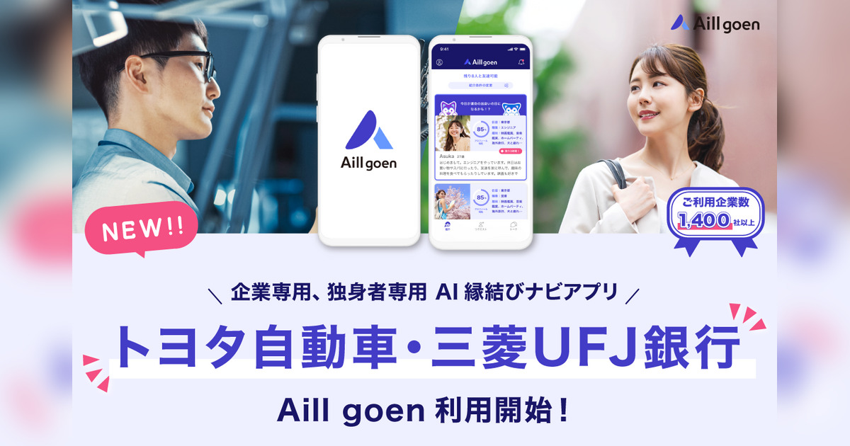 株式会社Aill(エール)(本社:東京都、代表取締役社長:豊嶋千奈、以下「当社」)が開発・提供する、企業専用AI恋愛ナビゲーションアプリ「Aill goen(エール ゴエン)」が、このたびトヨタ自動車株式会社および株式会社三菱UFJ銀行に導入されましたことをお知らせいたします。