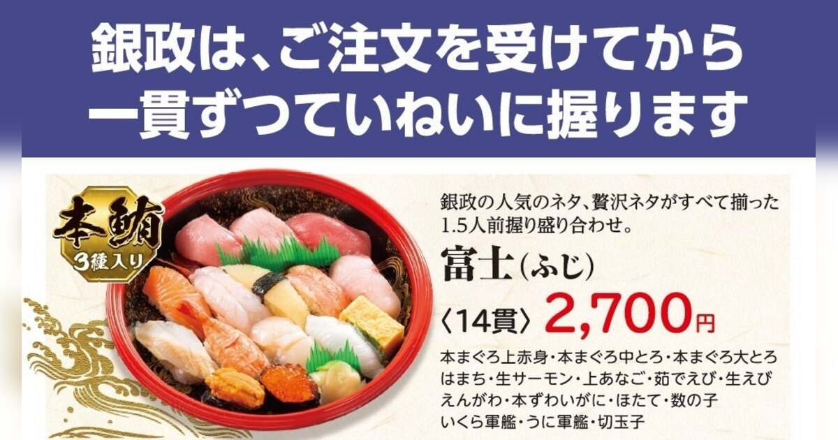銀政自慢の本まぐろなど贅沢ネタから、はまち・サーモン・あなご・いくら・玉子焼きといった人気ネタまで、味・彩り・ボリュームのバランスにこだわりぬいたラインナップとなっており、ご自宅でのおもてなしや職場での会食など、さまざまな場面で活躍します。