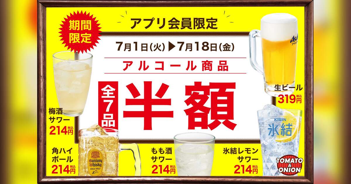 トマト&オニオンのアプリ会員限定で、アルコールが半額になるクーポンを配信いたします。